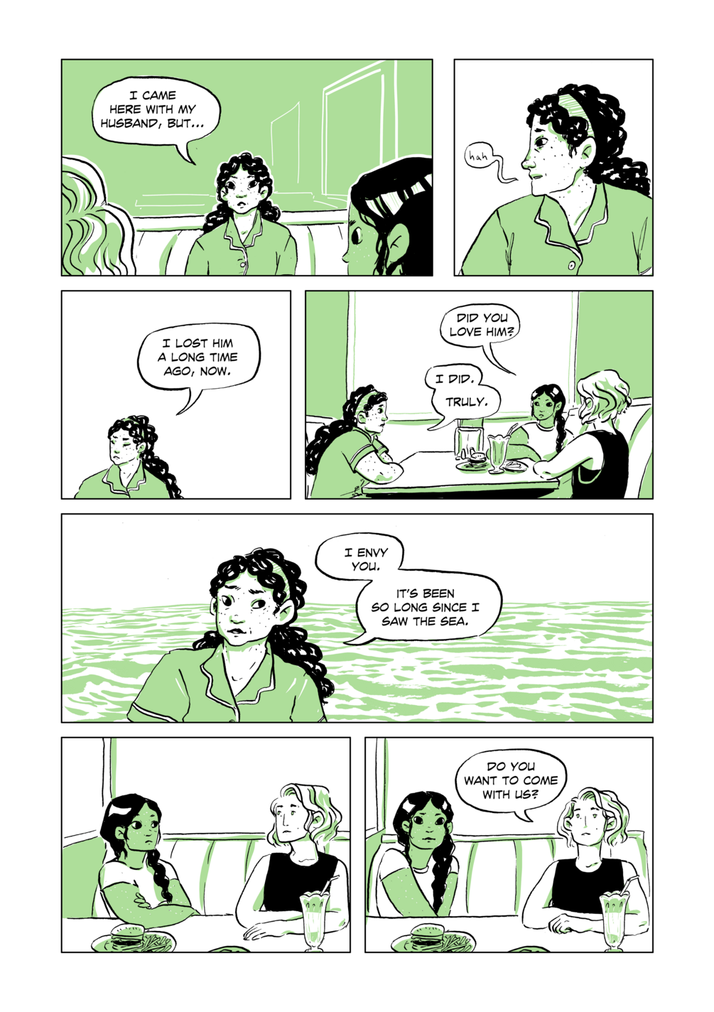 A selkie and her girlfriend take a road trip across the lower 48 to reclaim her coat. A story about agency, and making choices. 14 pages, spot color.